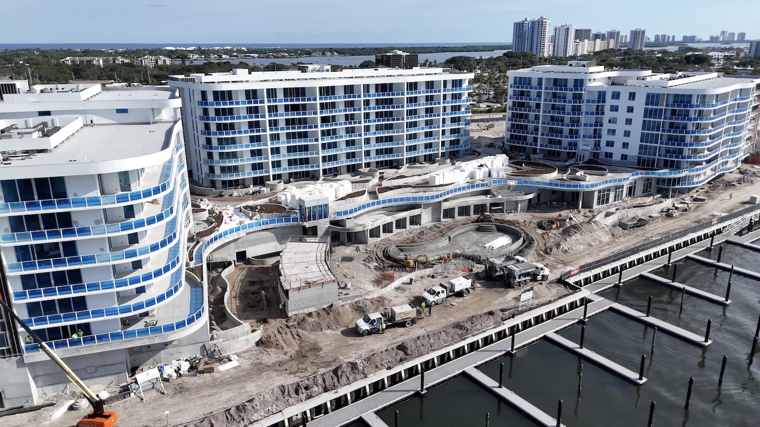 Windows and balcony railings are now fully installed, with the pool form currently being poured. Inside the residences, finishes are taking shape across kitchens and bathrooms. On the expansive pool and upper-level amenity decks, construction is advancing on the cabanas and other lifestyle spaces, while planters for the putting green, yoga lawn, and private terrace residences are complete. Work is also underway on the front guardhouse and entry gate.
